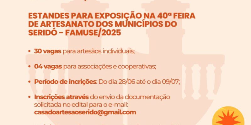 A Secretaria de Estado do Trabalho e da Habitação Social (SETHAS), por meio da Casa do Artesão do Seridó (CARTS), lançou um edital para seleção de artesãos individuais e organizações representativas do artesanato para participar da 40ª Feira de Artesanato dos Municípios do Seridó (FAMUSE/2025)….
