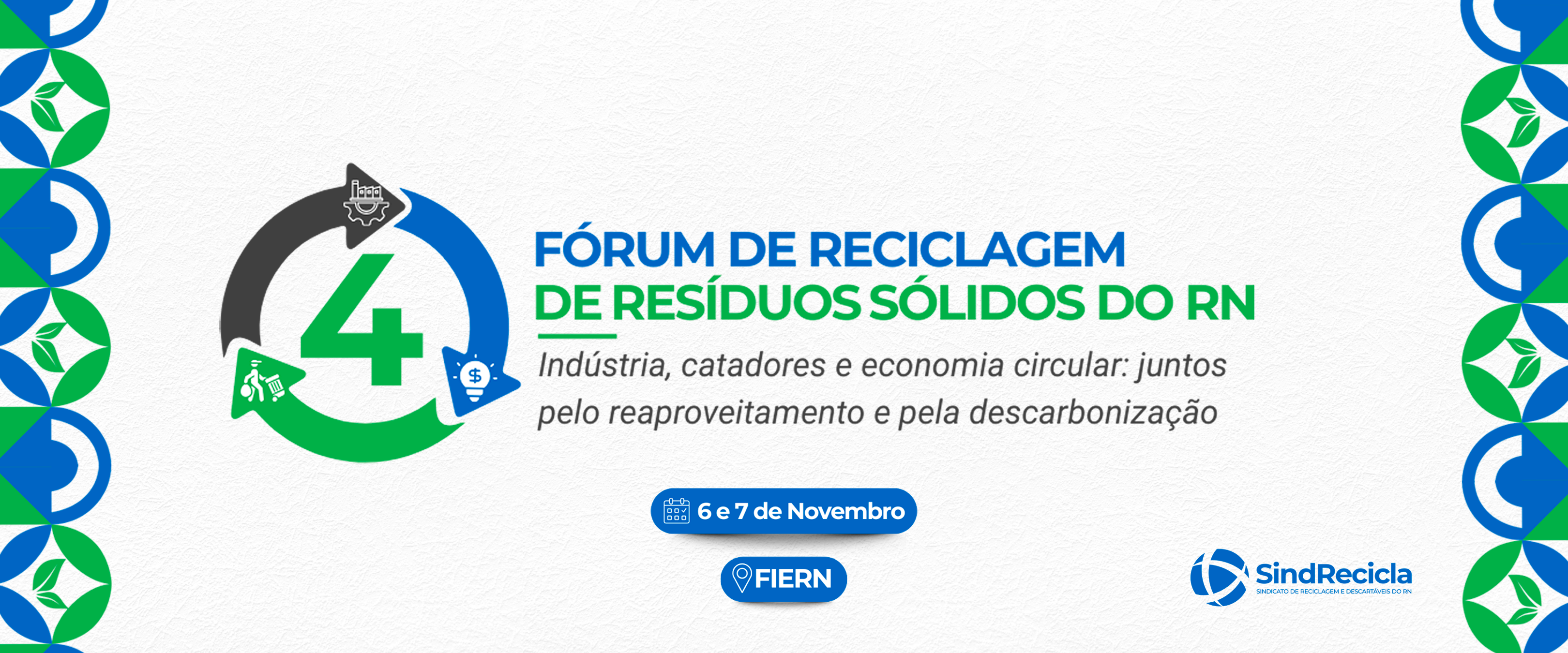 Com o objetivo de discutir a destinação correta de resíduos, as mudanças climáticas e a descarbonização, o Sindicato de Reciclagem e Descartáveis do RN (SINDRECICLA-RN) reunirá industriais, gestores públicos, especialistas, profissionais do setor ambiental, instituições de ensino e organizações sociais para a 4ª edição do Fórum de Reciclagem de Resíduos Sólidos do RN.