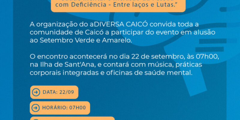 Na próxima segunda-feira, dia 22 de setembro, será realizado o evento aDIVERSA Caicó, na Ilha de Sant’Ana, a partir das 7 horas da manhã, em alusão à campanha Setembro Amarelo, mês dedicado à prevenção ao suicídio e à promoção da saúde mental. Com o tema…