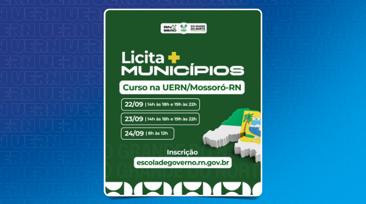 A Sala Multiuso da Biblioteca Central da Universidade do Estado do Rio Grande do Norte (Uern) em Mossoró sediará, nos dias 22, 23 e 24 deste mês, o curso Licita+Municípios, realizado pela Escola de Governo. O curso é destinado a todos(as) os(as) servidores(as) públicos estaduais,…