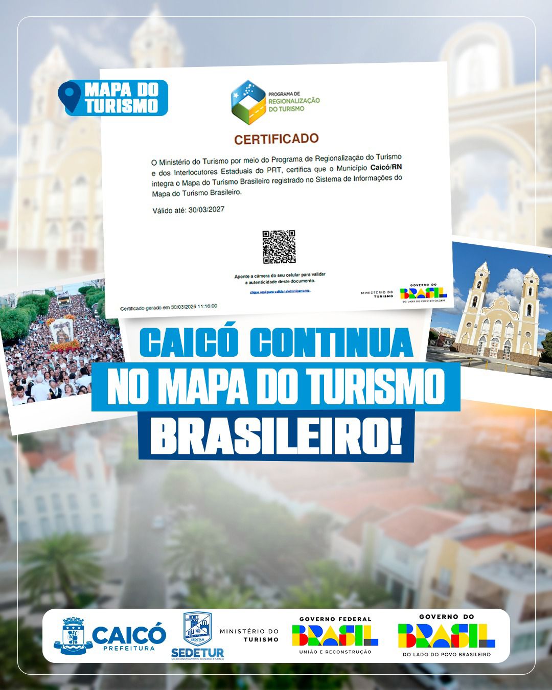 A permanência no Mapa do Turismo Brasileiro evidencia o trabalho contínuo desenvolvido pela gestão municipal no planejamento, organização e promoção do setor, consolidando Caicó como um dos principais destinos turísticos do Rio Grande do Norte, com destaque para o turismo cultural, religioso e de eventos.