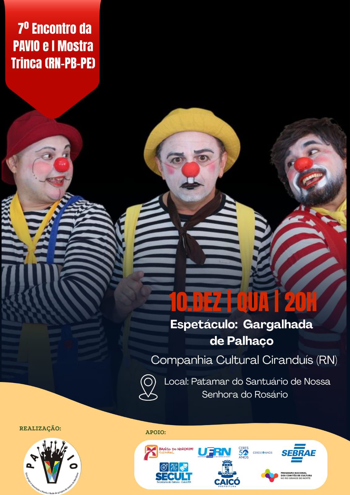 De 10 a 14 de dezembro, Caicó será sede do 7º Encontro da Rede PAVIO e da I Mostra Trinca (RN-PB-PE). A Rede PAVIO, formada por mais de 50 grupos de teatro dos nove estados do Nordeste, realiza o evento para fortalecer a cena teatral nordestina, promovendo diálogo, formação, intercâmbio artístico e debates sobre políticas públicas, com programação gratuita.