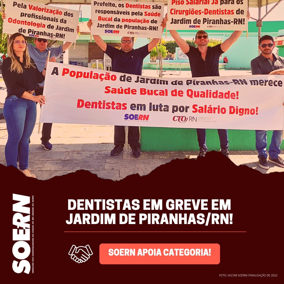 “Os cirurgiões-dentistas concursados do município de Jardim de Piranhas, Rio Grande do Norte, estão em GREVE a partir dessa semana! O SOERN está prestando apoio sindical e jurídico aos profissionais, que reivindicam da Prefeitura o pagamento do piso nacional dos Cirurgiões-dentistas de acordo com a Lei 3.999/61,