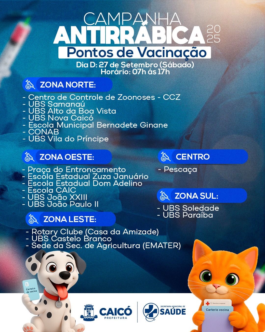 A Campanha de Vacinação Antirrábica 2025 terá seu Dia D em Caicó no próximo 27 de setembro (sábado), com postos fixos de vacinação distribuídos por toda a cidade. A Secretaria Municipal de Saúde (SMS) orienta que devem ser vacinados todos os cães e gatos a partir de três meses de idade que ainda não tenham recebido a dose em 2025.