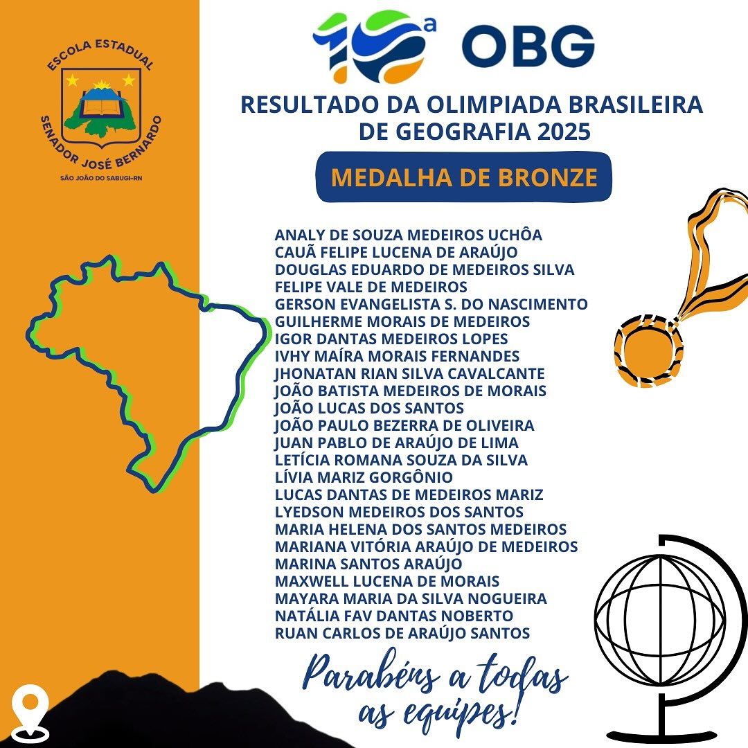 A Escola Estadual Senador José Bernardo, localizada no município de São João do Sabugi, na região do Seridó potiguar, conquistou um resultado extraordinário na edição mais recente da Olimpíada Brasileira de Geografia (OBG).