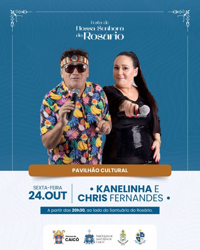 A programação social da Festa do Rosário de Caicó promete muita animação no Pavilhão Cultural, instalado ao lado do Santuário do Rosário. A partir das 20h30, o público poderá desfrutar de uma noite especial com apresentações de Kanelinha e Chris Fernandes, que levarão ao palco um repertório eclético, mesclando ritmos regionais e sucessos populares para agradar a todos os gostos.