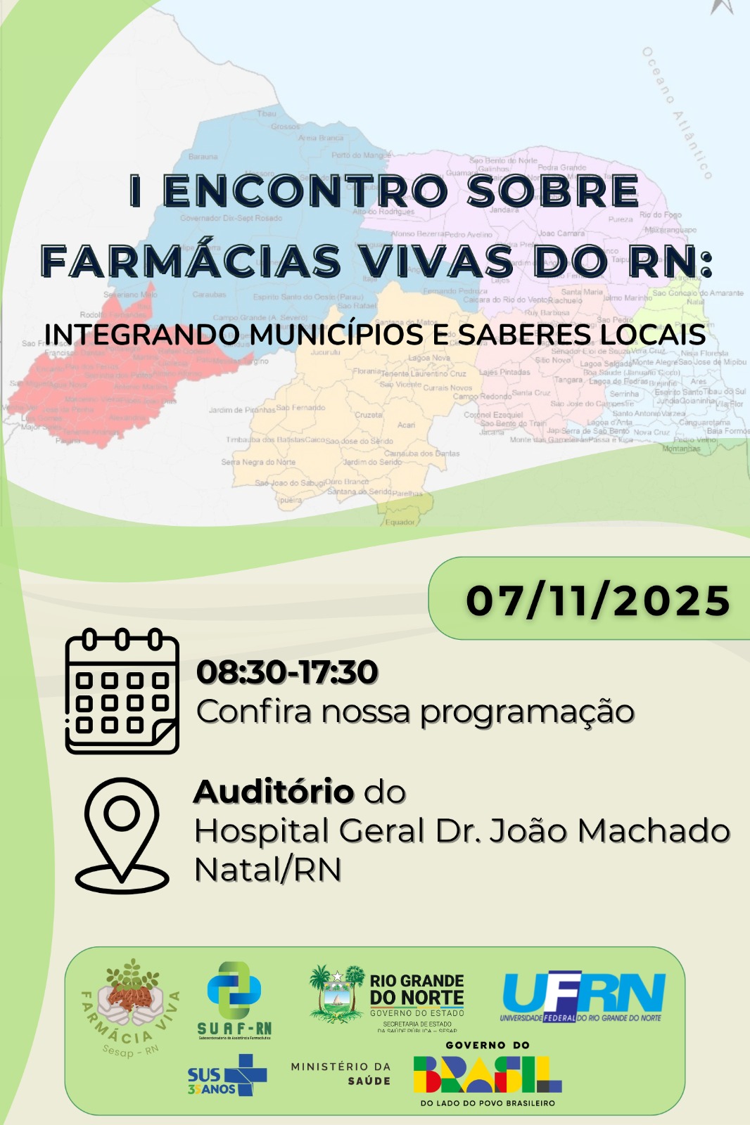 O evento organizado pela Secretaria de Estado da Saúde Pública (Sesap) em parceria com a Universidade Federal do RN (UFRN) acontece, das 8h30 às 17h30, no Auditório do Hospital Geral Dr. João Machado (Av. Alexandrino de Alencar, 1700 – Tirol) para compartilhar experiências, planejar ações efetivas e construir uma Rede Potiguar de Farmácias Vivas, integrando saberes tradicionais e científicos no uso de plantas medicinais e fitoterápicos no SUS.