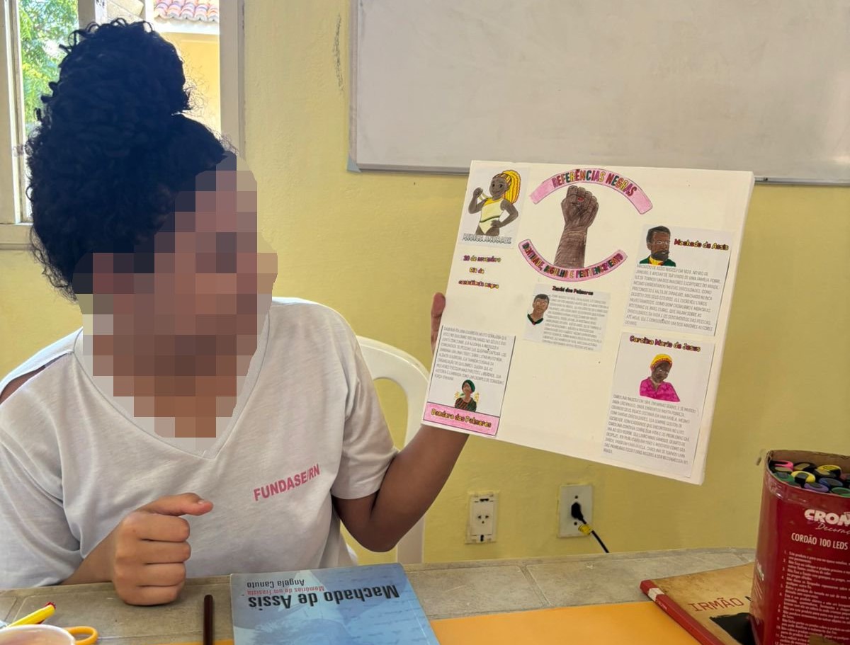 Em alusão ao Mês da Consciência Negra, a unidade socioeducativa feminina de internação da Fundase/RN, Casef Padre João Maria, realizou atividade com reflexão e diálogo. A leitura de um documento que aborda identidade, autoestima e pertencimento norteou o encontro, seguido da apresentação de personalidades negras importantes, como Rebeca Andrade, Carolina Maria de Jesus, Zumbi dos Palmares, Dandara e Machado de Assis.