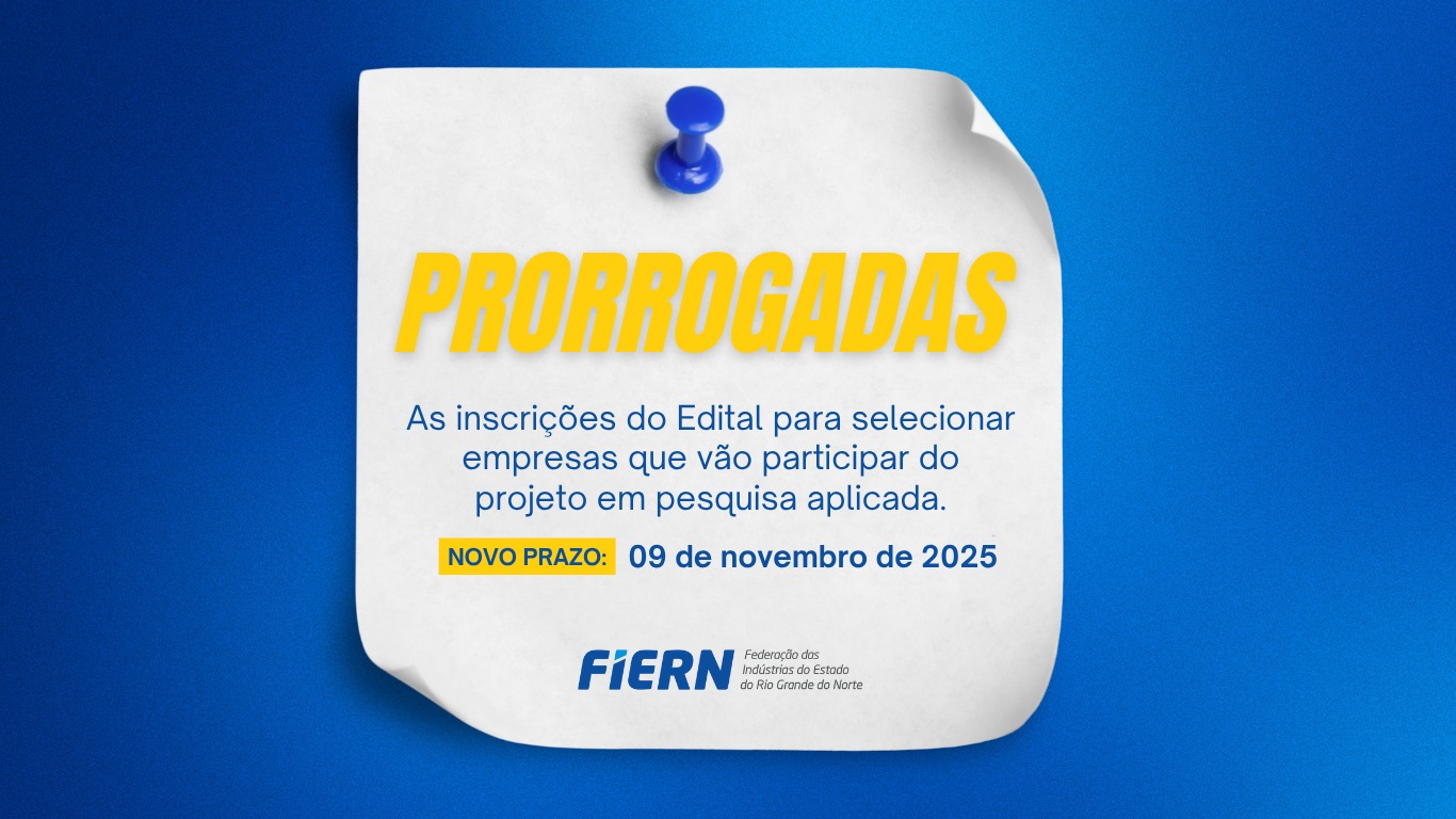 Encerram-se próximo domingo, 9 de novembro, as inscrições para o Edital nº 01/2025 — que seleciona empresas para participarem do projeto focado na importância da pesquisa aplicada para o desenvolvimento de soluções inovadoras nas empresas —, lançado pela Federação das Indústrias do Estado do Rio Grande do Norte (FIERN), em parceria com a Fundação de Apoio à Pesquisa do RN (FAPERN) e o Sebrae. O edital tem como objetivo estimular a criação de soluções inovadoras que impulsionem o crescimento e a competitividade das empresas.