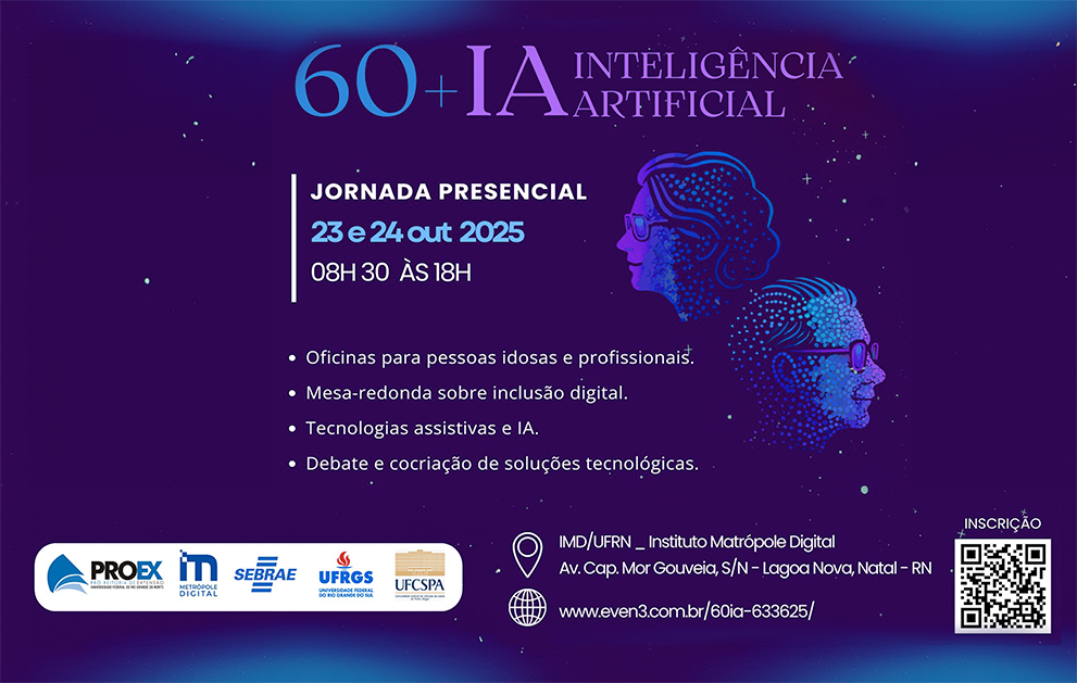 O Instituto Metrópole Digital (IMD/UFRN), por meio do Projeto de Extensão de Inclusão Digital para Idosos (ProEidi), abriu as inscrições para o evento Jornada 60+IA. O encontro será realizado nos dias 23 e 24 de outubro, de forma presencial, das 8h30 às 18h, na sede do IMD.