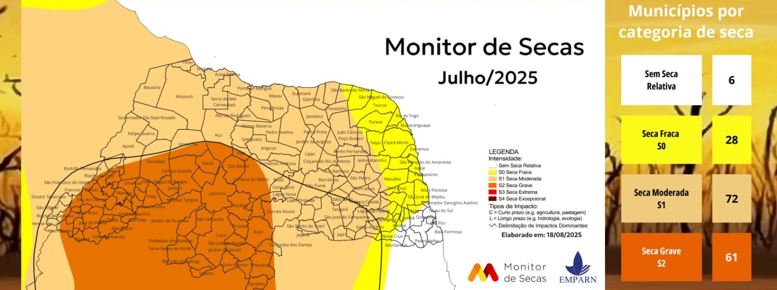 O Rio Grande do Norte registrou no mês de julho o índice de 96,4% dos seus municípios com algum nível de seca, sendo 36,54% com seca grave e 43,11% com seca moderada, segundo a classificação do Monitor de Secas, a partir de dados colhidos pela Agência Nacional de Águas (ANA) e seus parceiros.
