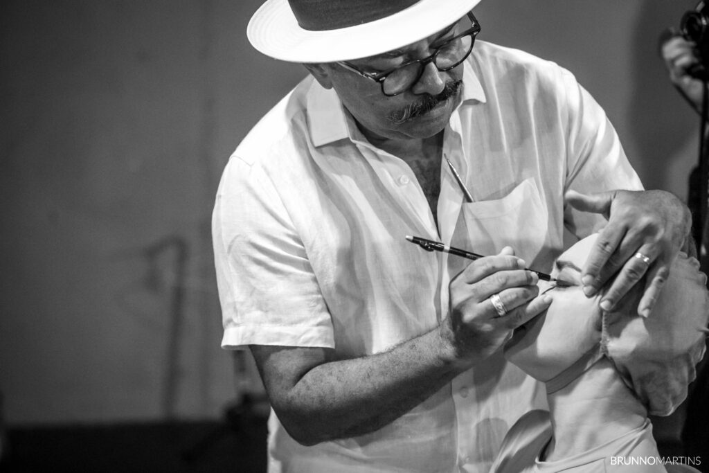 Para João Marcelino, que acompanha Titina desde quando a atriz ingressou no Grupo de Teatro Tambor, e que ao longo da vida assinou figurinos de diversos espetáculos em que ela atuou, o processo de criação da exposição se deu de forma muito próxima à própria construção da cena: “Titina era uma atriz de escuta, de profundidade, de posicionamento. Vestir Titina era um processo de troca, de ir construindo junto. Cada forma, cada dobra ia surgindo com a personagem. Assinar essa expografia agora é um gesto muito simbólico, é como seguir tecendo esses fios que a gente começou lá atrás.”