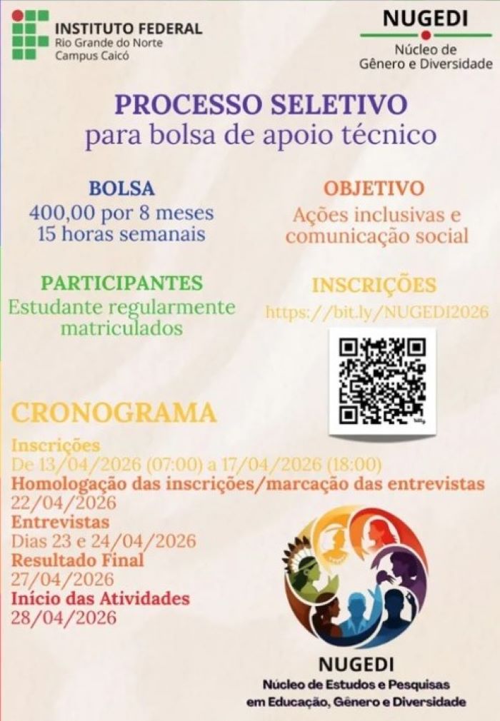 O Campus Caicó do Instituto Federal do Rio Grande do Norte (IFRN) anunciou a abertura de um novo processo seletivo destinado à concessão de bolsas de apoio para o Núcleo de Estudos e Pesquisas em Gênero e Diversidade (NUGEDI). A iniciativa busca fortalecer as ações do núcleo, que desempenha um papel fundamental na promoção da equidade e no combate às diversas formas de preconceito no ambiente acadêmico.