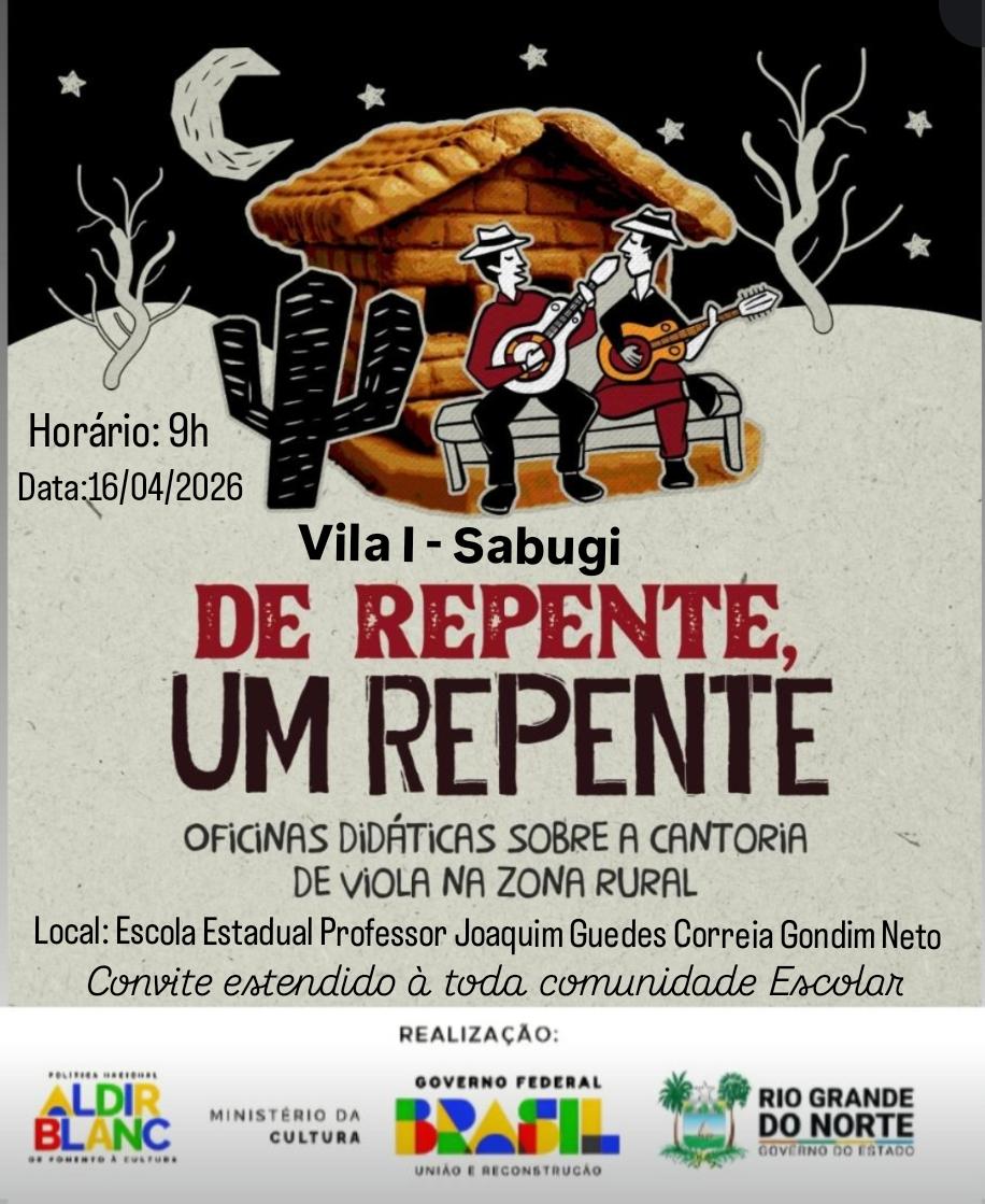 O Projeto “De Repente Um Repente”, inicia na próxima quinta-feira, 16, levando Oficinas Didáticas e Cantoria de Viola, para escolas da Vila Sabugi I, Distrito Palma, e Caicó RN.