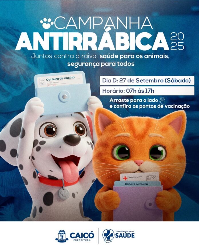 A Prefeitura Municipal de Caicó, por meio da Secretaria Municipal de Saúde, realiza nesta quarta-feira (24), às 9h, uma entrevista coletiva sobre o Dia D da Vacinação Antirrábica. Na ocasião, o secretário de Saúde, Gedson Santos, apresentará todos os detalhes da campanha, que tem como principal objetivo garantir a imunização de cães e gatos contra a raiva — protegendo a saúde dos animais e prevenindo riscos à saúde pública.