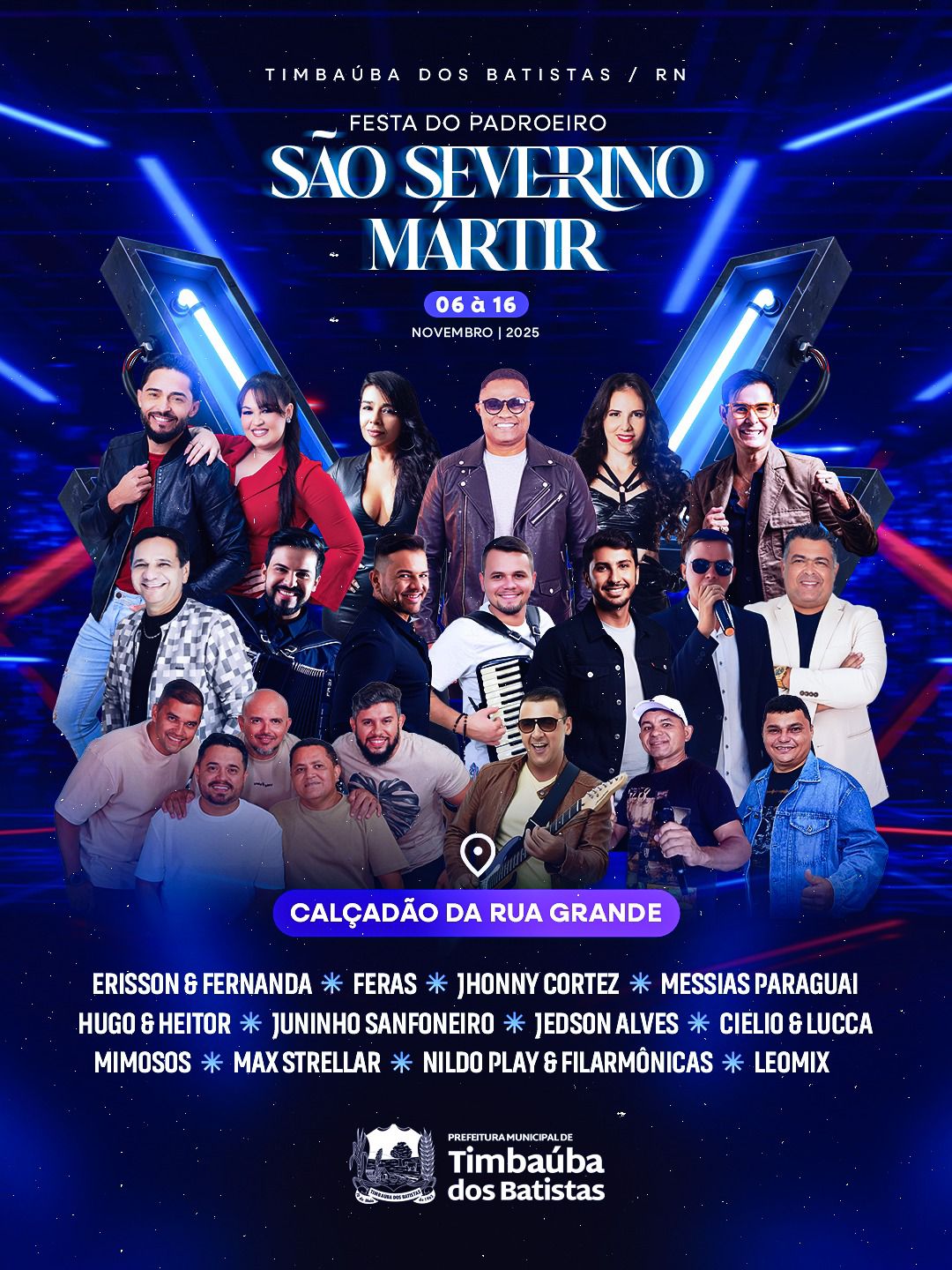 A cidade de Timbaúba dos Batistas, no Seridó potiguar, já se prepara para um dos eventos mais aguardados da região: a Festa do Padroeiro São Severino Mártir, que acontecerá de 06 a 16 de novembro de 2025. Unindo fé, cultura, esporte e entretenimento, a programação promete movimentar o município e atrair visitantes de várias cidades do Seridó.
