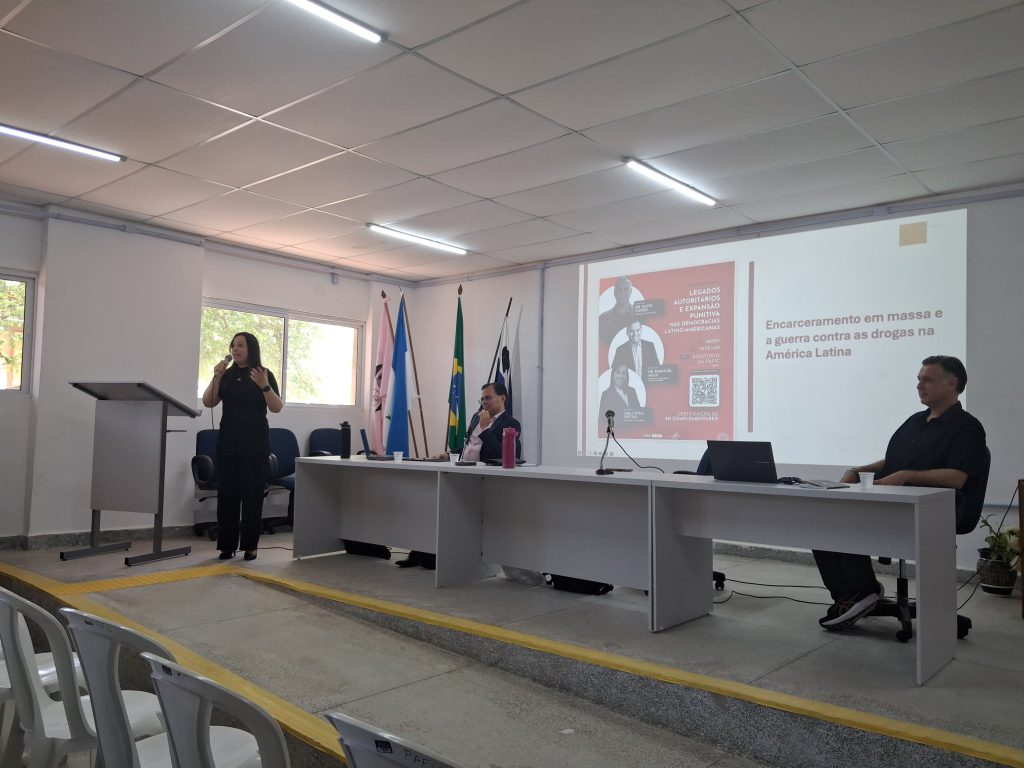Em sua fala de abertura, Cíntia Freitas também compartilhou como surgiu a ideia da mesa-redonda. “Aproveitei a vinda do professor Silvio ao Brasil e o convidei por sua relevante discussão sobre a guerra contra as drogas e o encarceramento massivo, com foco especial no encarceramento feminino. Em seguida, decidi convidar o professor Emanuel, docente da Faculdade de Direito da nossa instituição, que também aborda a questão do direito penal. O objetivo foi reunir os dois para discutir os legados autoritários que intensificam o sistema punitivo no Brasil”, relatou.