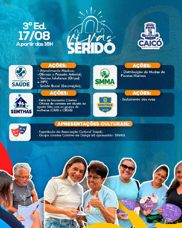 Os caicoenses poderão desfrutar de mais um domingo de muito lazer e serviços importantes em um espaço de convivência, saúde e cultura. Trata-se da 3ª edição do Viva a Seridó que acontecerá dia 17, a partir das 16h. O evento, realizado uma vez por mês, transforma a Avenida Seridó no trecho entre a Biblioteca Pública Olegário Vale e a Praça da Catedral de Sant’Ana em um grande corredor de lazer, inspirado no modelo da Avenida Paulista, em São Paulo.